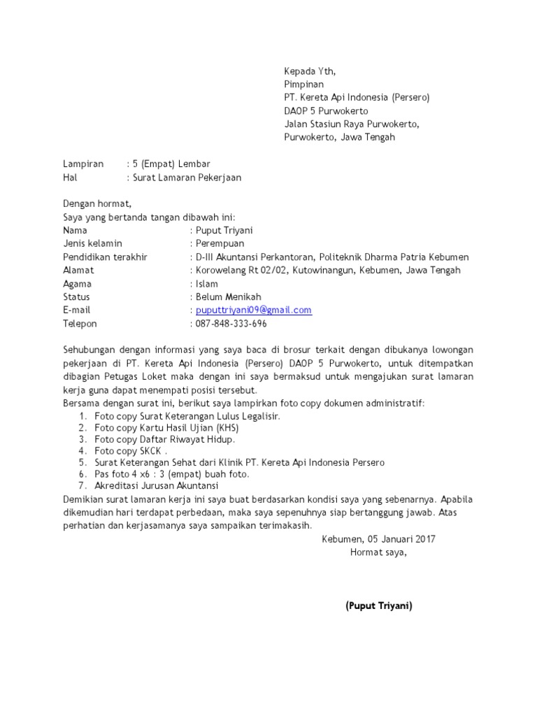 Surat lamaran kerja juga dibuat satu halaman penuh, dan biasanya surat lamaran kerja ini perihal : Surat lamaran yang menarik akan memberi peluang yang lebih besar untuk mendapat perhatian bagi para pimpinan perusahaan pencari kerja, sehingga peluang untuk dipanggil sesi wawancara sangatlah besar. Berikut ini contoh surat lamaran kerja untuk posisi administrasi. Fungsi pentingnya membuat surat lamaran kerja pt kai. Adapun data diri saya adalah sebagai berikut
